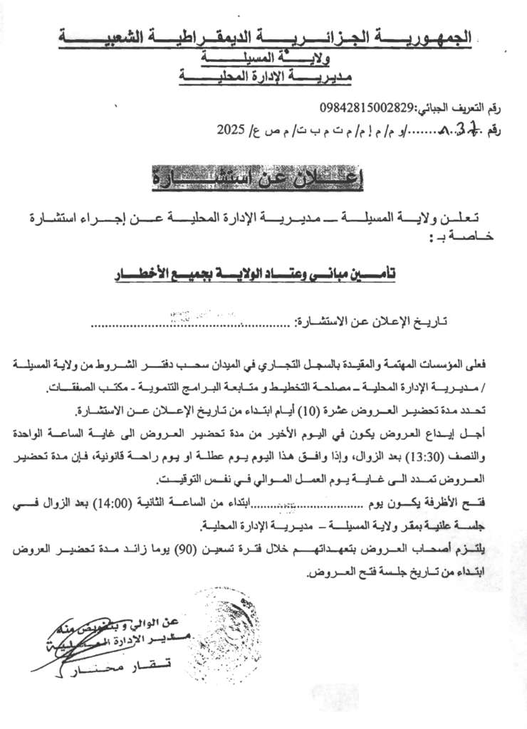 إعلان عن استشارة تأمين مباني وعتاد الولاية بجميع الأخطار/ مديرية الادارة المحلية لولاية المسيلة
