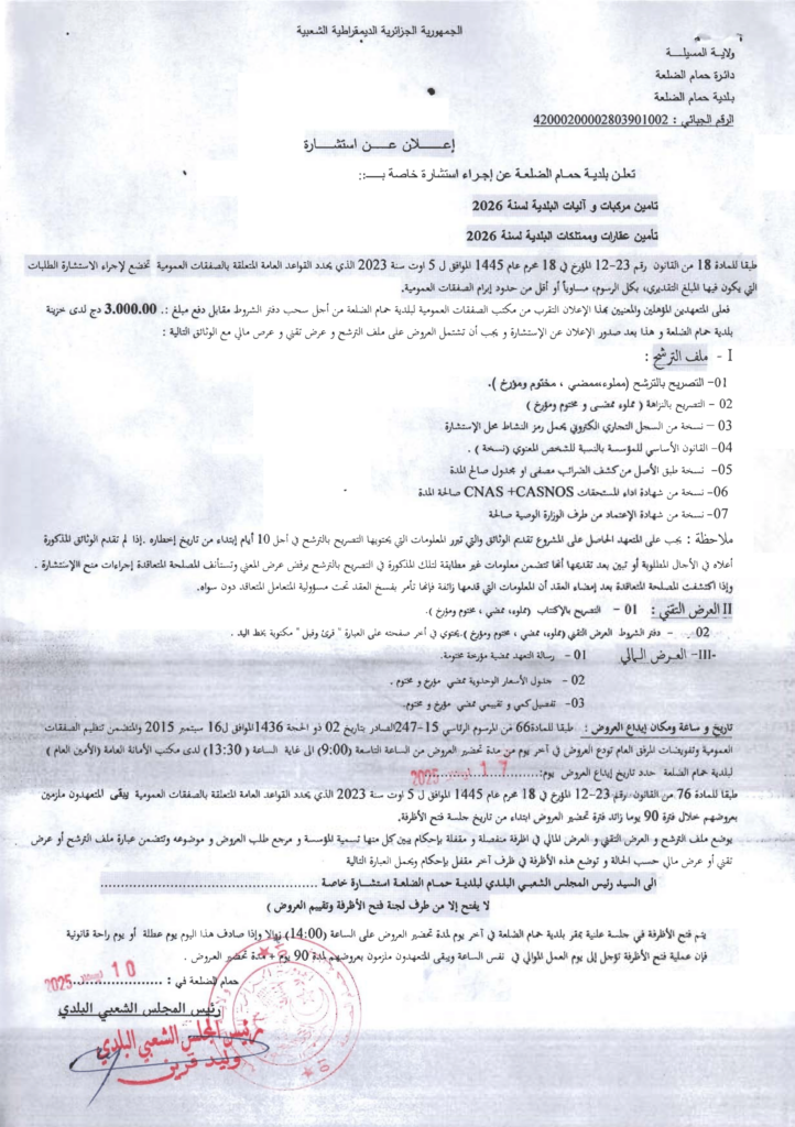 إعلان عن استشارة تأمين مركبات وآليات وعقارات وممتلكات البلدية لسنة 2026/ بلدية حمام الضلعة