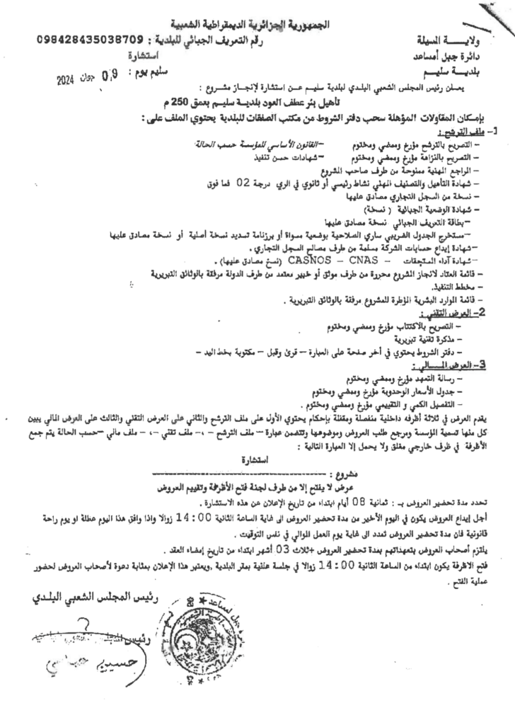 إعلان عن استشارة تأهيل بئر عطف العود بعمق 250 م بلدية سليم