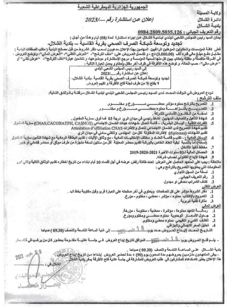 إعلان عن استشارة: تجديد وتوسعة شبكة الصرف الصحي بقرية القاسية بلدية الشلال