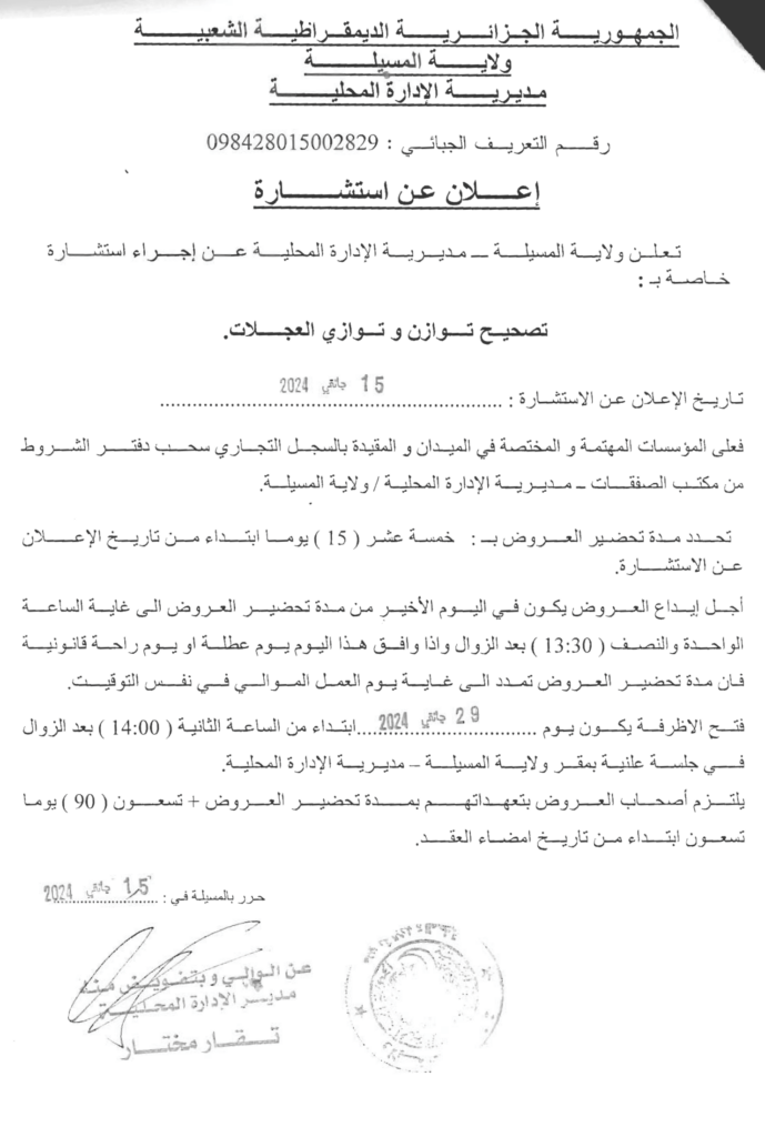 إعلان عن استشارة: تصحيح توازن و توازي العجلات/ مديرية الادارة المحلية
