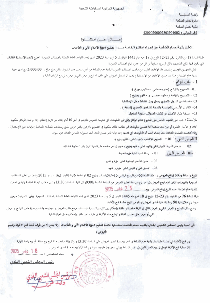 إعلان عن استشارة تصليح أجهزة الإعلام الآلي والطابعات/ بلدية حمام الضلعة