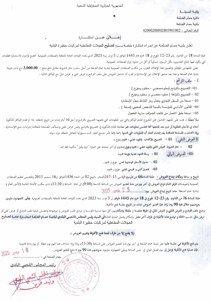 إعلان عن استشارة تصليح العجلات المطاطية لمركبات حظيرة البلدية/ بلدية حمام الضلعة