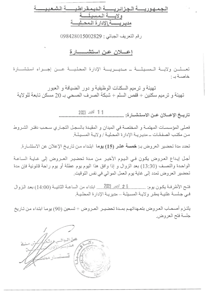 إعلان عن استشارة: تهيئة وترميم السكنات الوظيفية ودور الضيافة والعبور/ مديرية الإدارة المحلية لولاية المسيلة