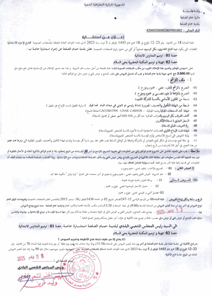 إعلان عن استشارة تهيئة وترميم المدارس الابتدائية والمكتبة الحضرية/ بلدية حمام الضلعة