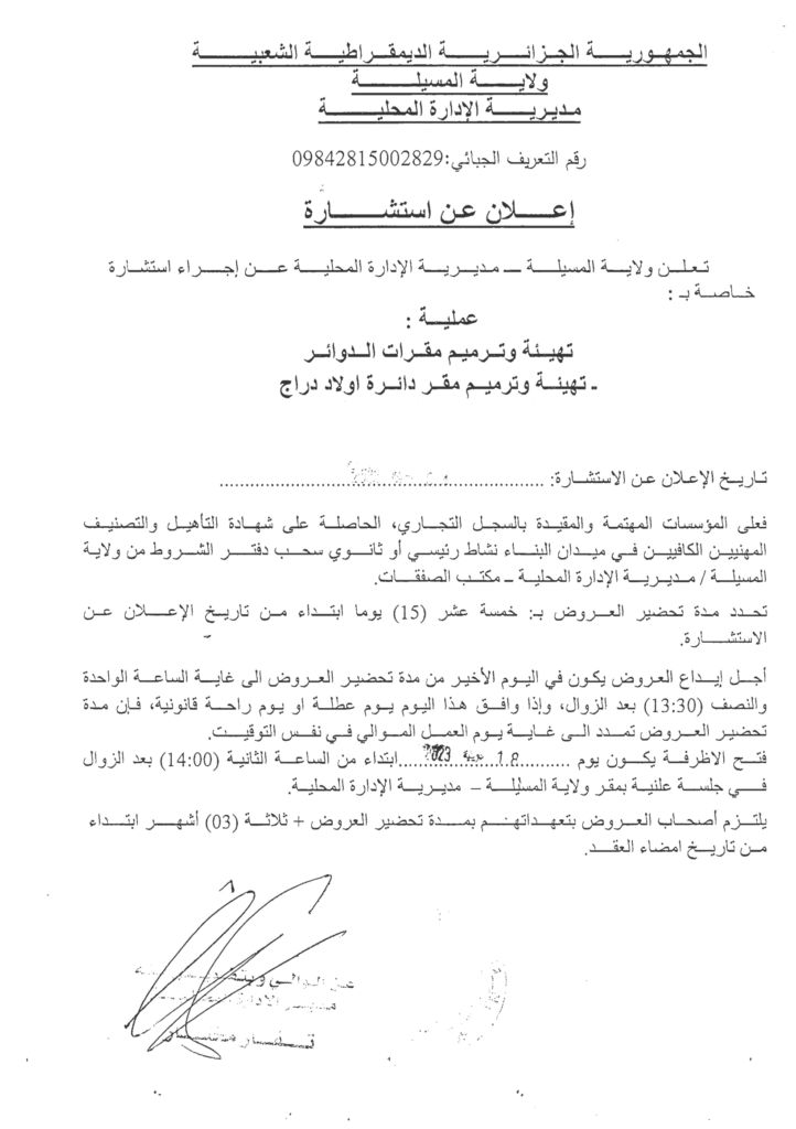 إعلان عن استشارة: تهيئة وترميم مقرات الدوائر/ مديرية الإدارة المحلية لولاية المسيلة