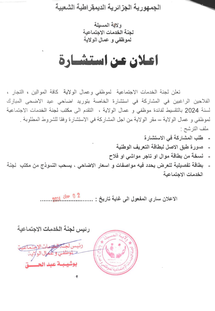 إعلان عن استشارة: توريد اضاحي عيد الأضحى المبارك لسنة 2024/ لجنة الخدمات الاجتماعية لموظفي وعمال ولاية المسيلة
