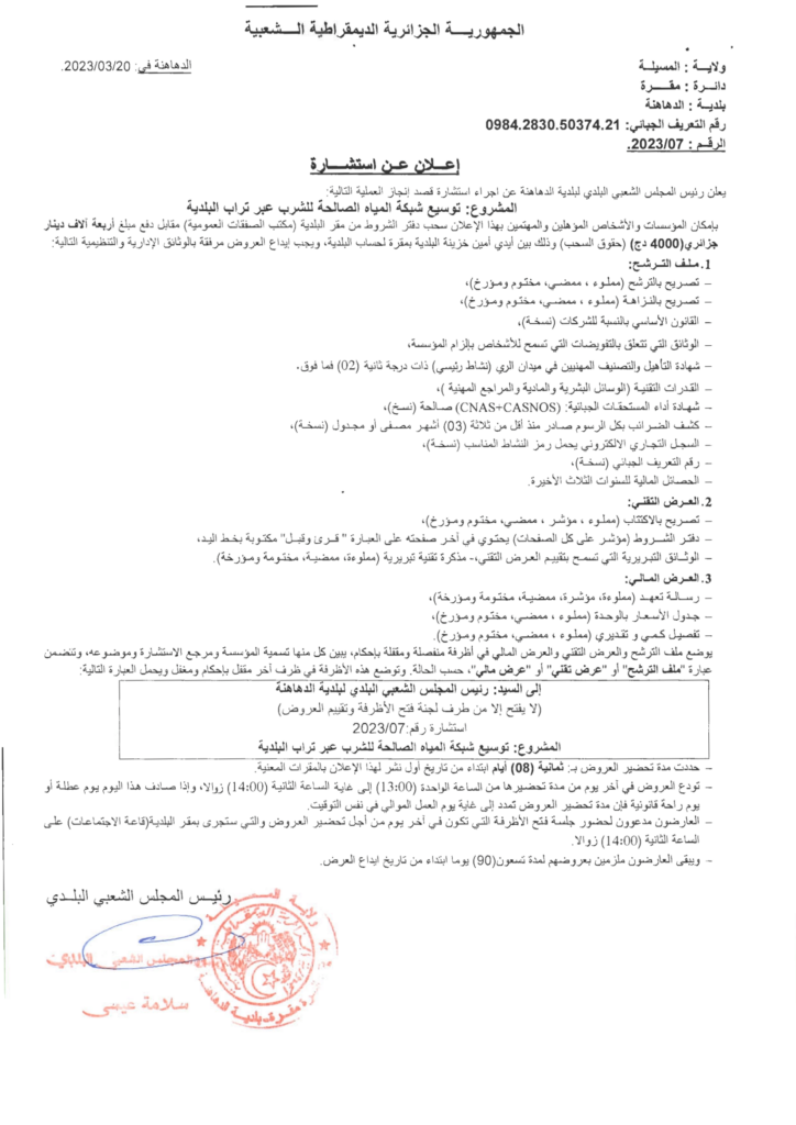 إعلان عن استشارة: توسيع شبكة المياه الصالحة للشرب عبر تراب بلدية الدهاهنة