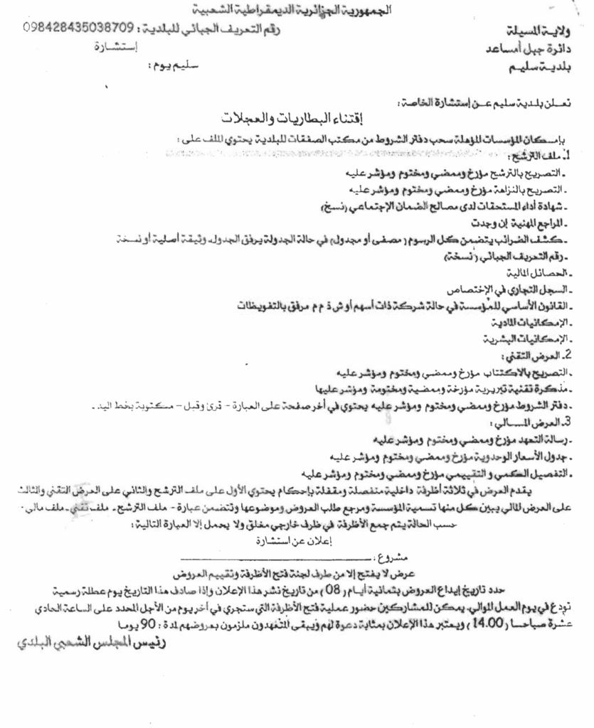 إعلان عن استشارة خاصة باقتناء البطاريات والعجلات/ بلدية سليم