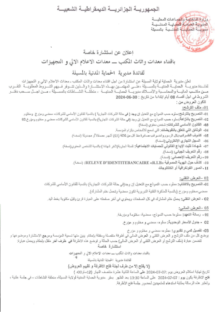 إعلان عن استشارة خاصة باقتناء معدات وأثاث المكتب-معدات الاعلام الآلي والتجهيزات لفائدة مديرية الحماية المدنية بالمسيلة
