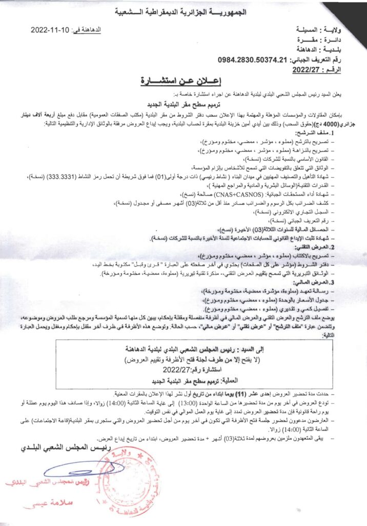 إعلان عن استشارة خاصة بـ ترميم سطح مقر البلدية الجديد بلدية الدهاهنة