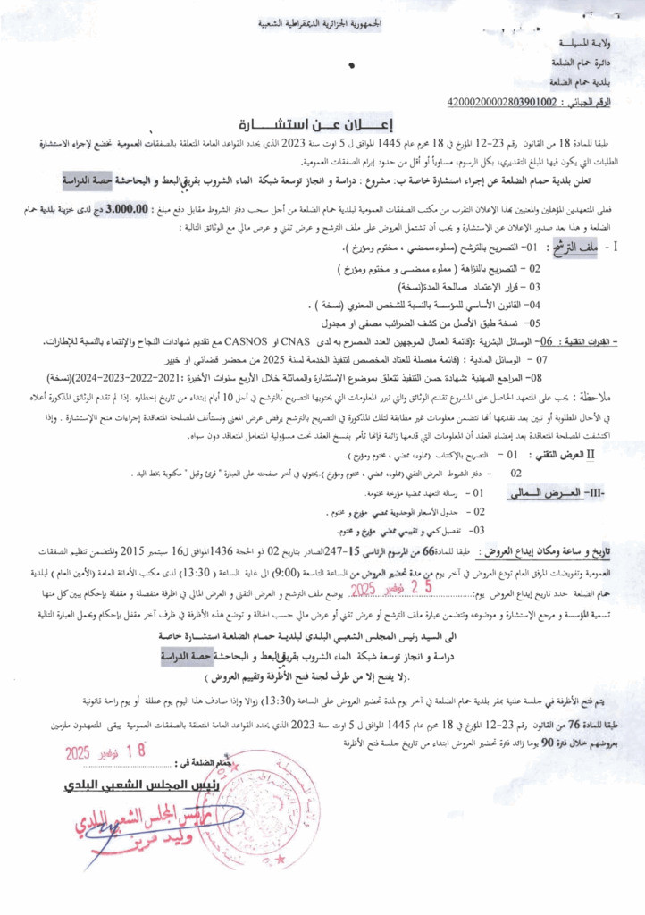 إعلان عن استشارة دراسة وانجاز توسعة شبكة الماء الشروب بقريتي البعط والبحاحشة/ بلدية حمام الضلعة
