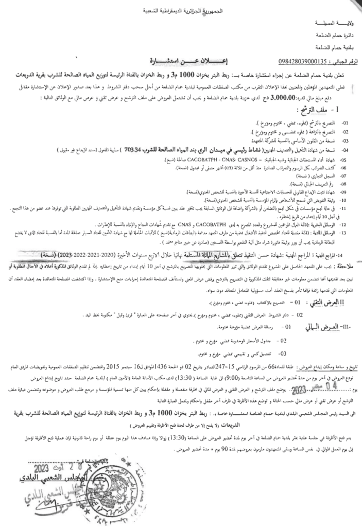 إعلان عن استشارة: ربط البئر بخزان 1000 م3 وربط الخزان بالقناة الرئيسية بقرية الدريعات بلدية حمام الضلعة