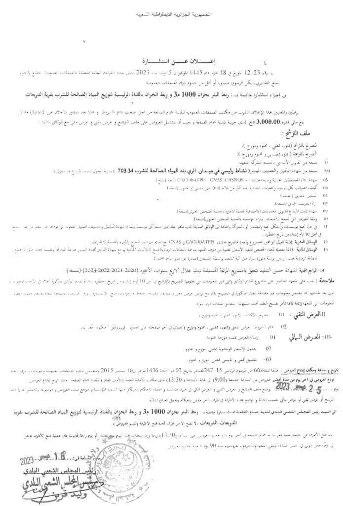 إعلان عن استشارة: ربط خزان بـ 1000م3 وبالقناة الرئيسية لتوزيع المياه الصالحة للشرب بقرية الدريعات