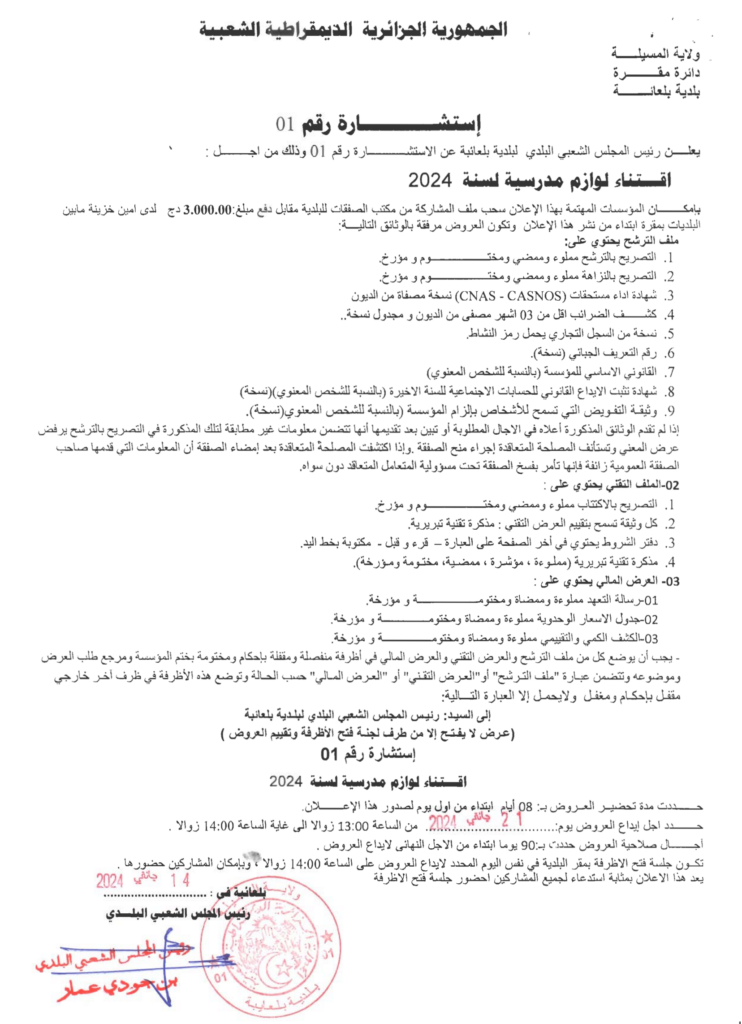 إعلان عن استشارة رقم 01: اقتناء لوازم مدرسية لسنة 2024/ بلدية بلعايبة