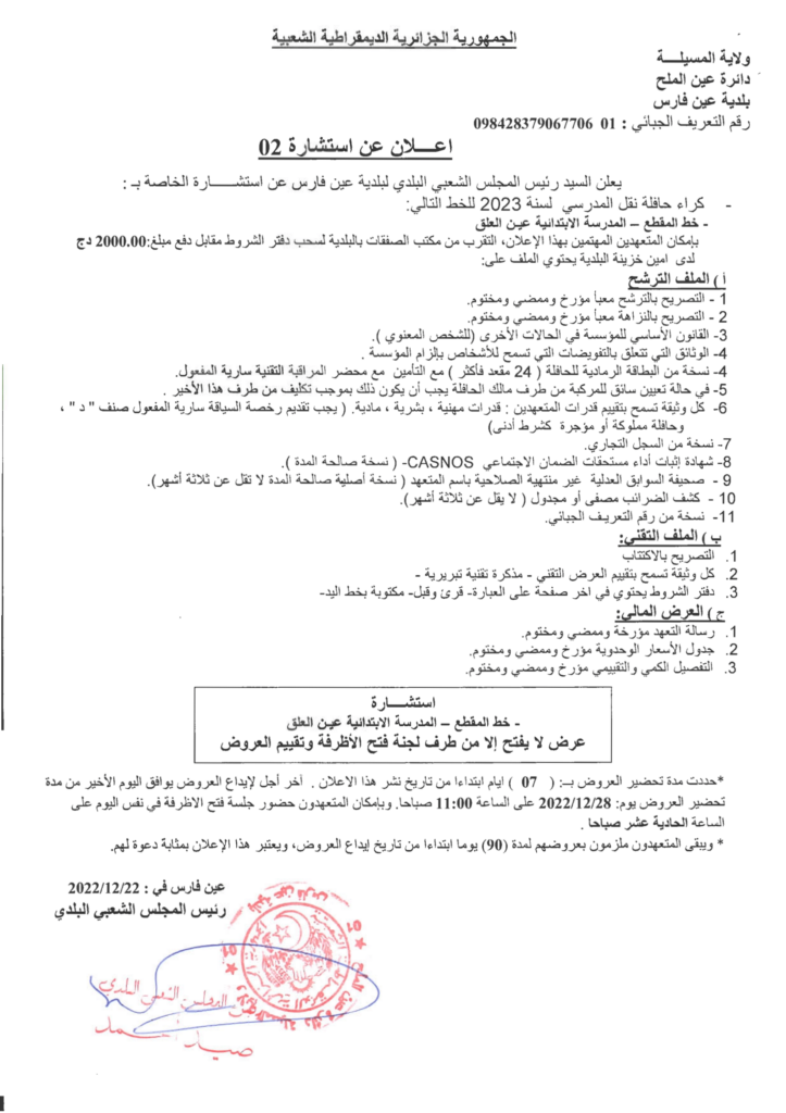 استشارة خاصة بـ : كراء حافلة نقل المدرسي لسنة 2023 للخط التالي: خط المقطع -المدرسة الابتدائية عين العلق-22 ديسمبر، 20220 34 شاركها فيسبوك X مشاركة عبر البريد طباعة