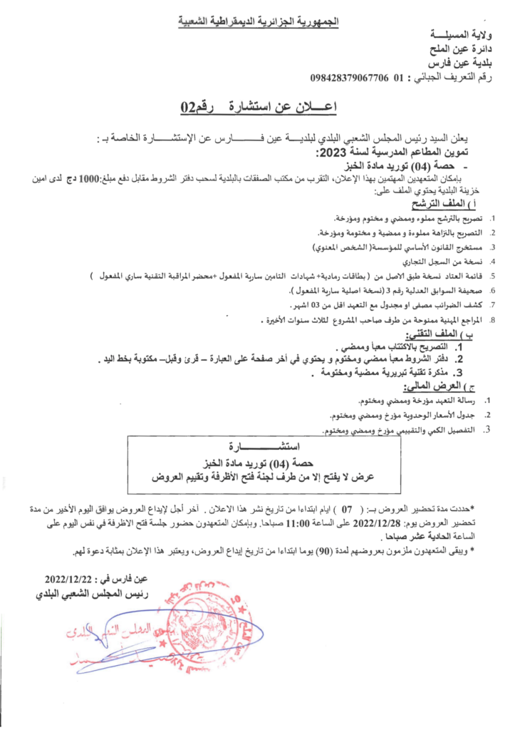 استشارة خاصة بـ : تموين المطاعم المدرسية لسنة 2023حصة (04) توريد مادة الخبز22 ديسمبر، 20220 90 شاركها فيسبوك X مشاركة عبر البريد طباعة