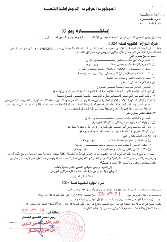 إعلان عن استشارة رقم 03: شراء اللوازم المكتبية لسنة 2024/ بلدية بلعايبة