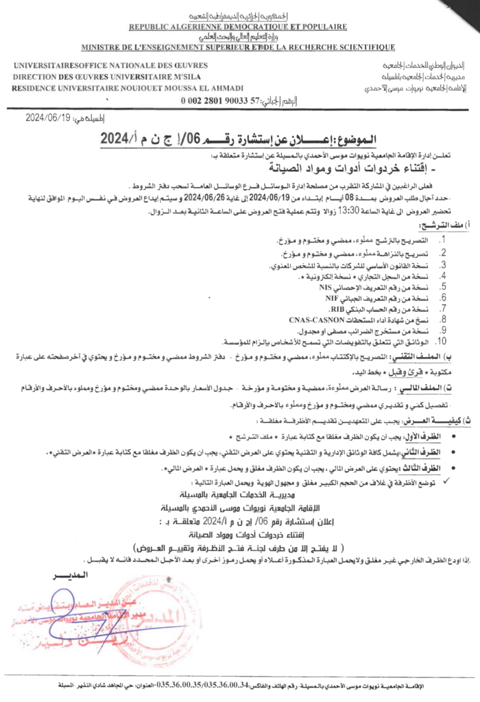 إعلان عن استشارة رقم 06/ إ ج ن م أ/2024 مديرية الخدمات الجامعية المسيلة