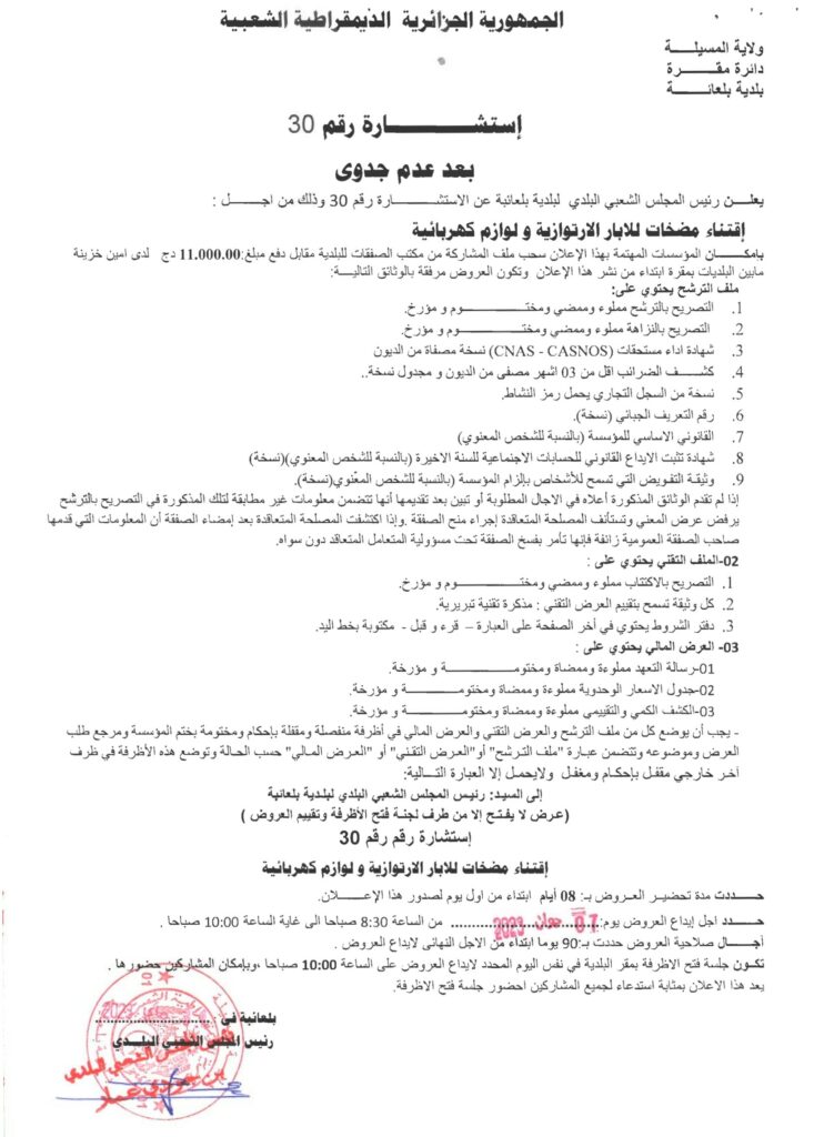 استشارة رقم 30 وذلك من أجل: إقتناء مضخات للآبار الارتوازية ولوازم كهربائية1 يونيو، 20230 2 شاركها فيسبوك X مشاركة عبر البريد طباعة