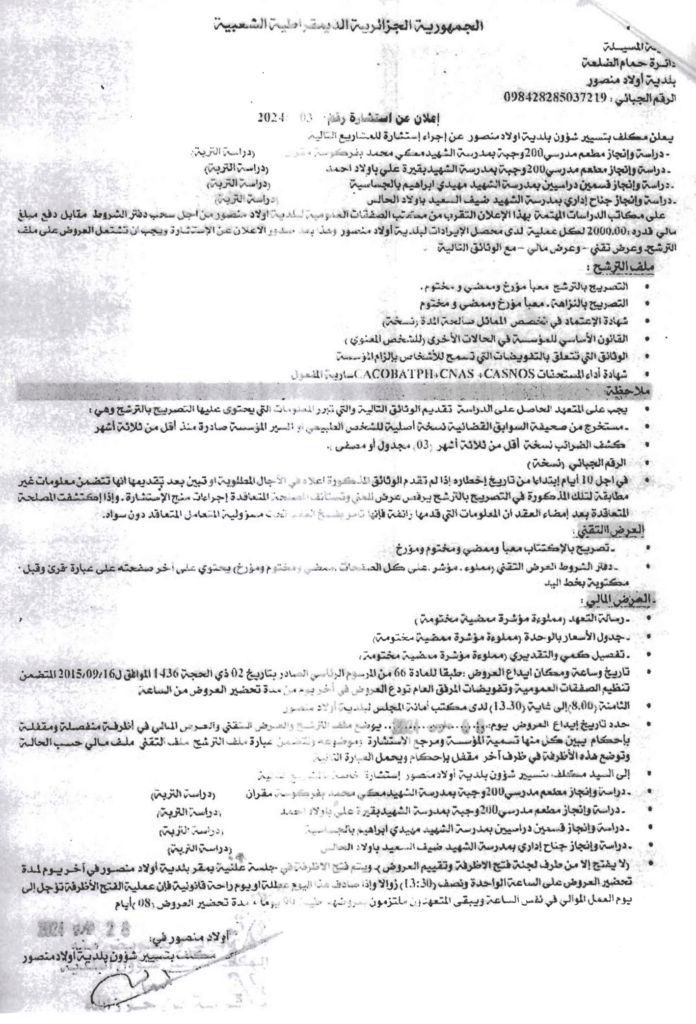 إعلان عن استشارة رقم 2024/03 بلدية أولاد منصور