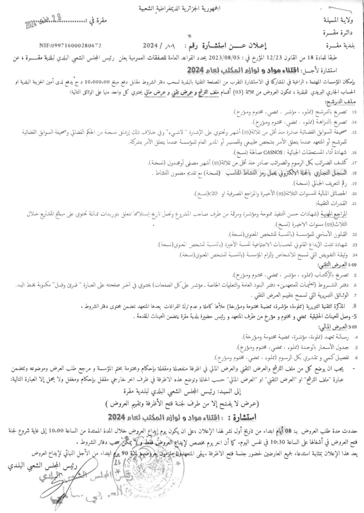 استشارة من أجل: اقتناء مواد ولوازم المكتب لعام 20244 مارس، 20240 11 شاركها فيسبوك X مشاركة عبر البريد طباعة