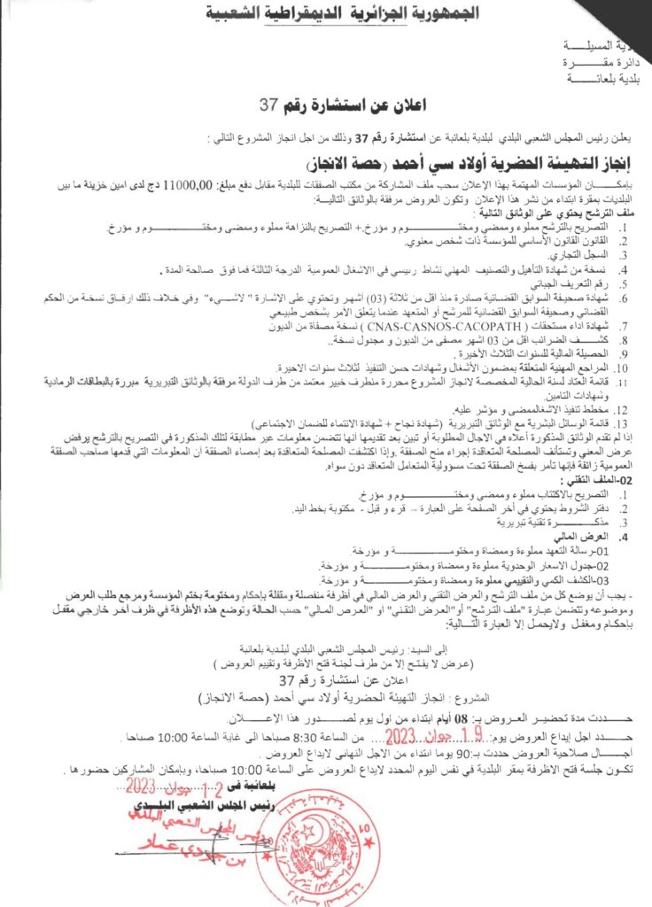 استشارة ذلك من أجل انجاز المشروع التالي: انجاز التهيئة الحضرية أولاد سي أحمد14 يونيو، 20230 18 شاركها فيسبوك X مشاركة عبر البريد طباعة