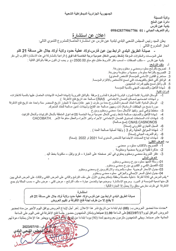 إعلان عن استشارة: صيانة الطريق البلدي الرابط بين عين فارس – أولاد عطية على مسافة 21 كم