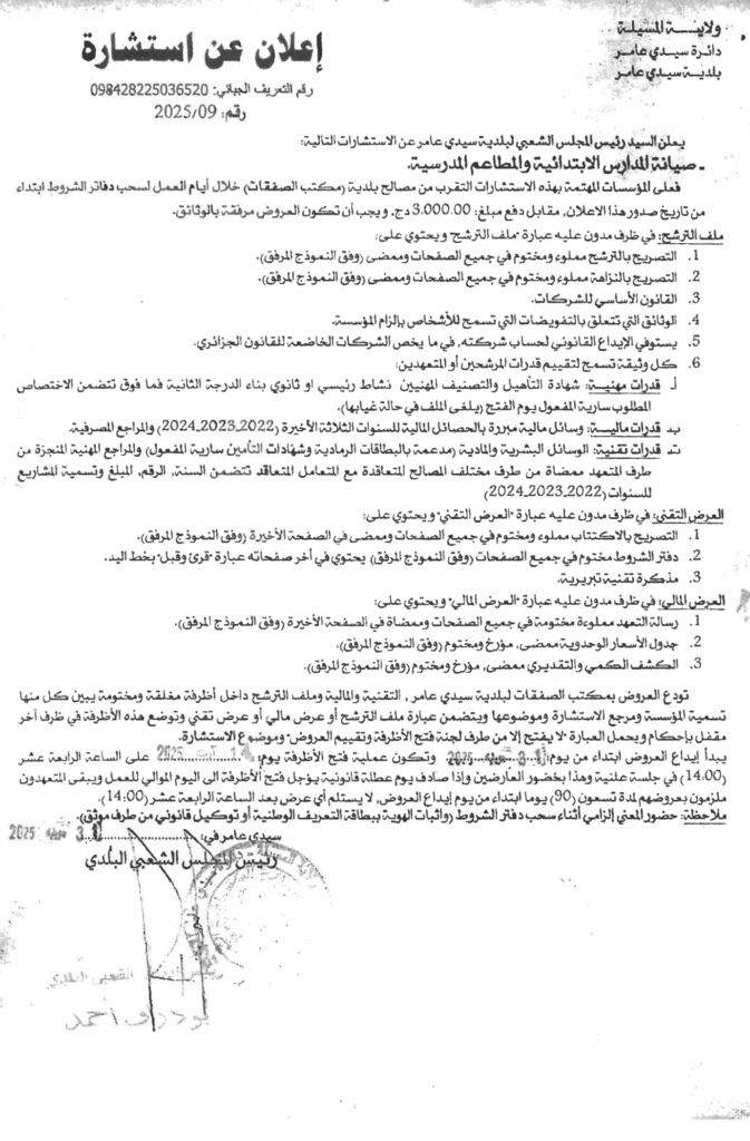 إعلان عن استشارة صيانة المدارس الابتدائية والمطاعم المدرسية/ بلدية سيدي عامر