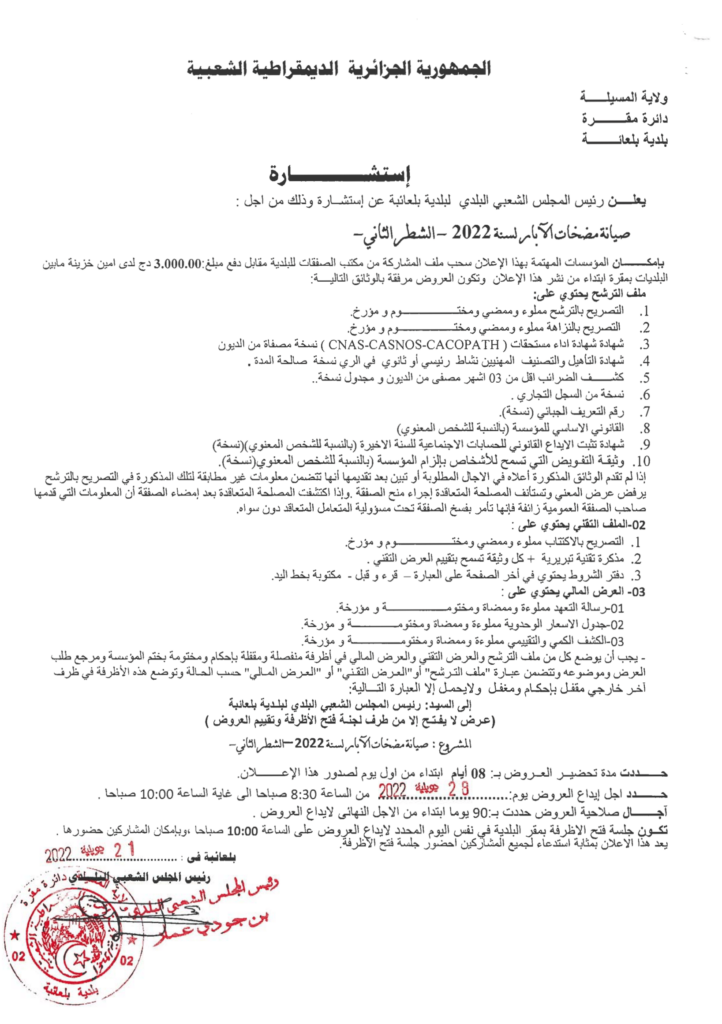 إعلان عن استشارة: صيانة مضخات الآبار لسنة 2022-الشطر الثاني- بلدية بلعايبة