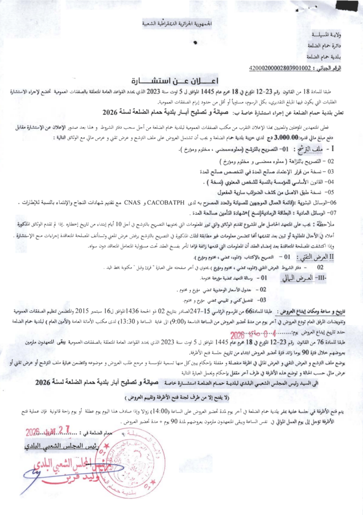 إعلان عن استشارة صيانة وتصليح آبار بلدية حمام الضلعة لسنة 2026