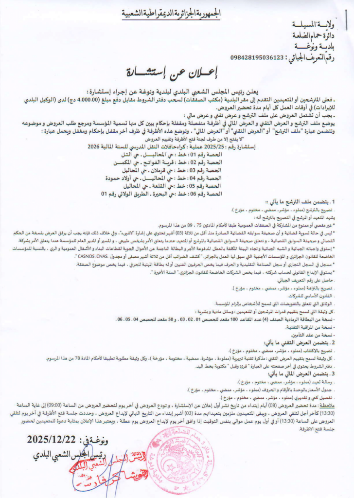 إعلان عن استشارة عمبلية كراء حافلات النقل المدرسي 2026/ بلدية ونوغة