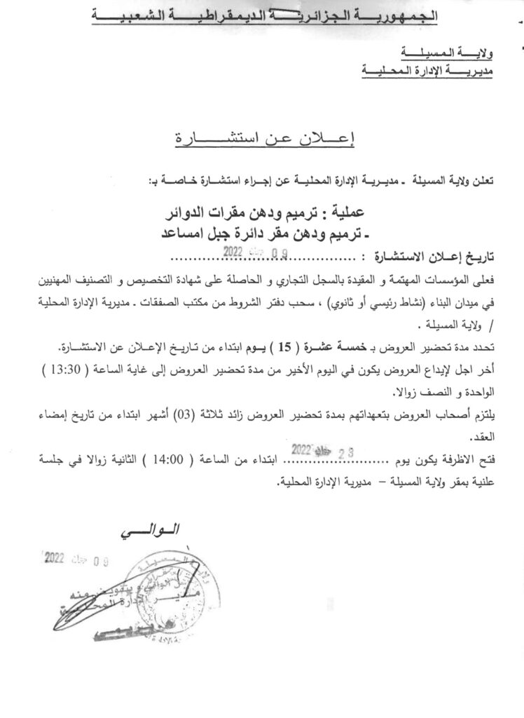 إعلان عن استشارة: عملية ترميم ودهن مقرات الدوائر مديرية الإدارة المحلية لولاية المسيلة