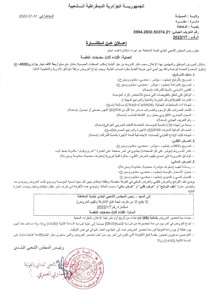إعلان عن استشارة قصد الإنجاز العملية اقتناء ثلاث مضخات غاطسة بلديــة دهـاهنـة