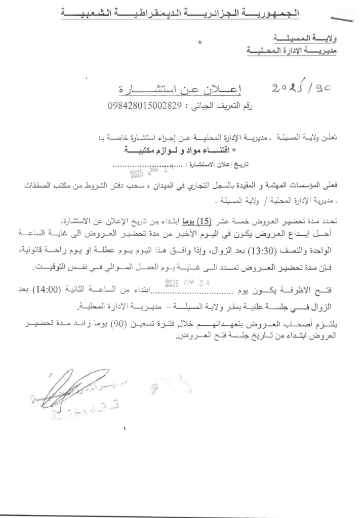 إعلان عن استشارة لاقتناء لوازم مكتبية/ مديرية الادارة المحلية لولاية المسيلة