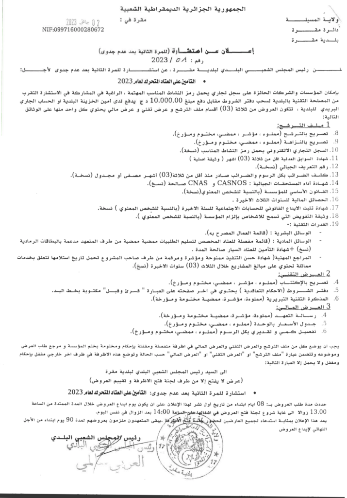 استشارة للمرة الثانية بعد عدم جدوى لاجل: التامين على العتاد المتحرك لعام 20234 يناير، 20230 35 شاركها فيسبوك X مشاركة عبر البريد طباعة