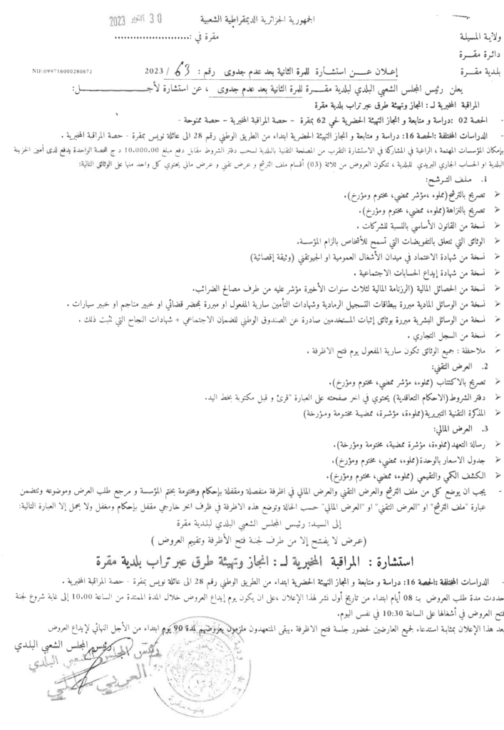 استشارة من أجل: المراقبة المخبرية لانجاز وتهيئة طرق عبر تراب بلدية مقرة5 نوفمبر، 20230 7 شاركها فيسبوك X مشاركة عبر البريد طباعة