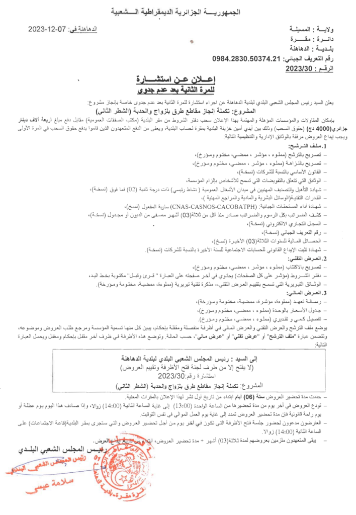 استشارة من أجل: تكملة انجاز مقاطع طرق بلزواج والحدبة (الشطر الثاني)10 ديسمبر، 20230 12 شاركها فيسبوك X مشاركة عبر البريد طباعة