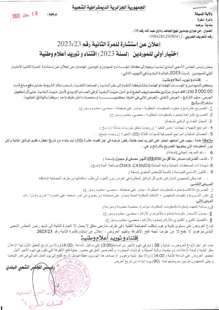 إعلان عن استشارة للمرة الثانية 2023/23 اختيار أولي للموردين (لسنة 2023) إقتناء وتوريد أعلام وطنية