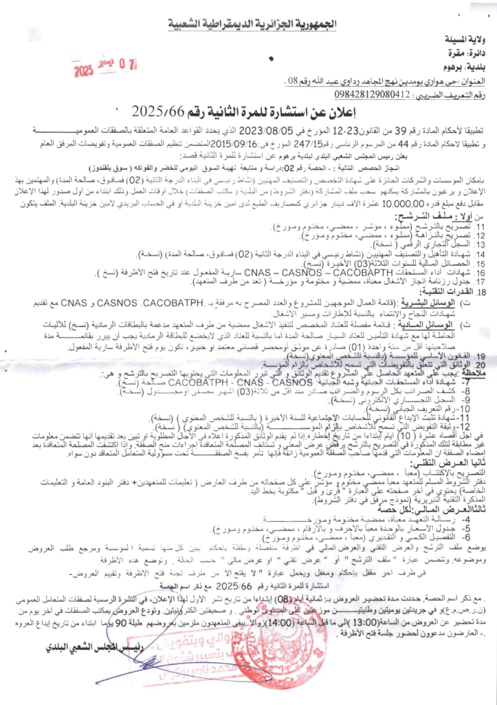 إعلان عن استشارة للمرة الثانية 2025/66 بلدية برهوم