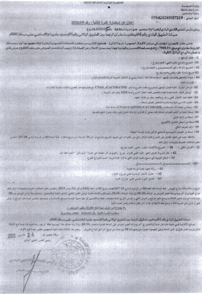 إعلان عن استشارة للمرة الثانية 2026/05 صيانة الطريق البلدي رقم 02 فركوسة مقران بين ط و رقم 01 وحدود بلدية أولاد ماضي على مسافة 800م/ بلدية أولاد منصور