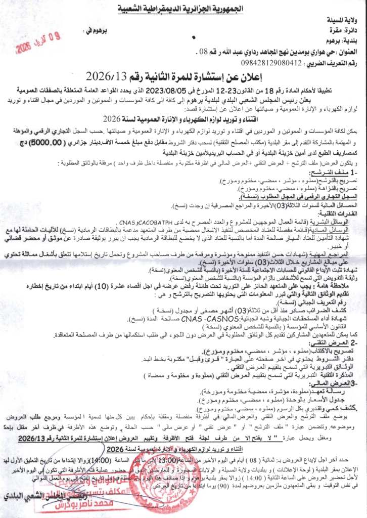 إعلان عن استشارة للمرة الثانية 2026/13 بلدية برهوم
