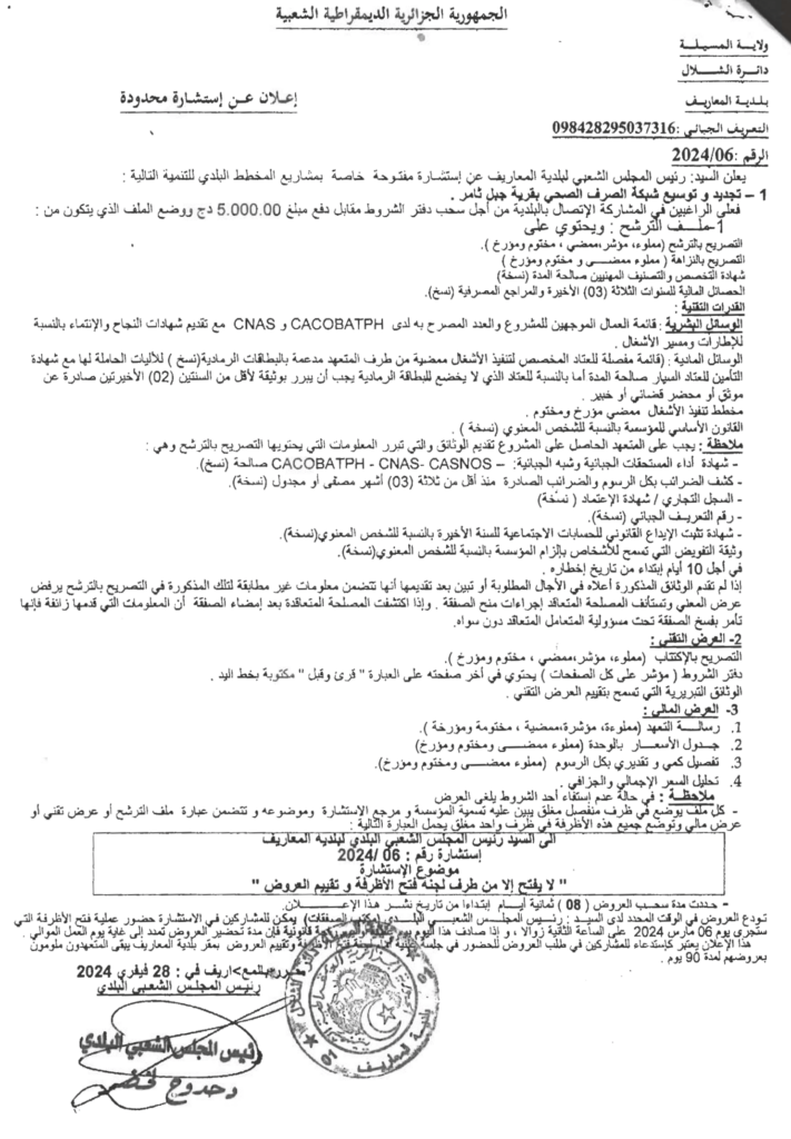 إعلان عن استشارة محدودة 2024/06 بلدية معاريف