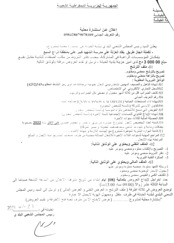 إعلان عن استشارة محلية: تكملة انجاز طريق يفك العزلة على مدرسة الشهيد كبير علي بمنطقة ذراع السبع/ بلدية الخبانة
