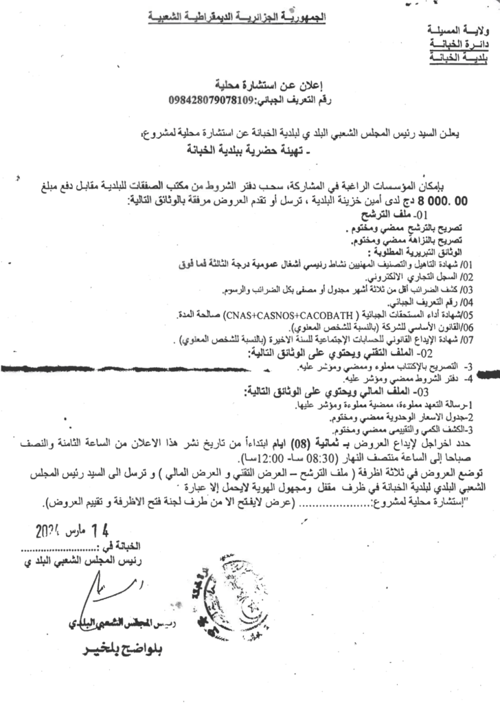 إعلان عن استشارة محلية: تهيئة حضرية ببلدية الخبانة