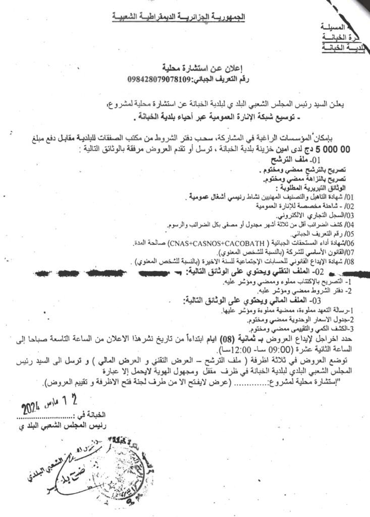 إعلان عن استشارة محلية: توسيع شبكة الانارة العمومية عبر أحياء بلدية الخبانة