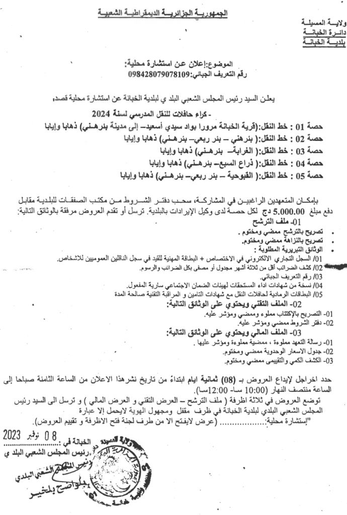 إعلان عن استشارة محلية: كراء حافلات للنقل المدرسي لسنة 2024 بلدية الخبانة