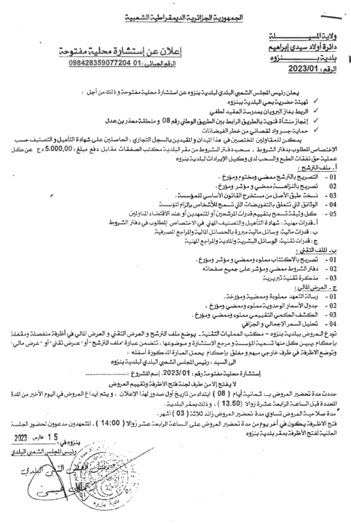 استشارة محلية مفتوحة لأجل:تهيئة حضرية بحي البلدية.الربط بغاز البروبان بمدرسة العقيد لطفي.انجاز منشأة قنوية بالطريق الرابط بيم الطريق الوطني رقم 08 ومنطقة معذر بن عدل.حماية جسر واد لقصاني من خطر الفيضانات.19 مارس، 20230 70 شاركها فيسبوك X مشاركة عبر البريد طباعة