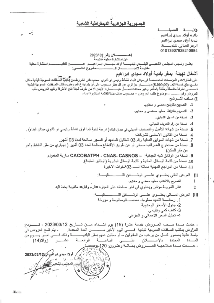 استشارة محلية مفتوحة لإنجاز المشروع التالي: أشغال تهيئة بمقر البلدية22 مارس، 20230 14 شاركها فيسبوك X مشاركة عبر البريد طباعة