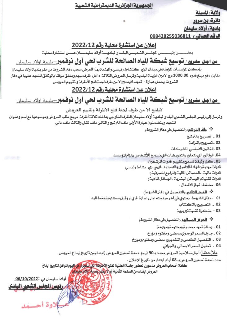 استشارة محلية من أجل مشروع: توسيع شبكة المياه الصالحة للشرب لحي أول نوفمبر -بلدية أولاد سليمان-9 أكتوبر، 20220 16 شاركها فيسبوك X مشاركة عبر البريد طباعة